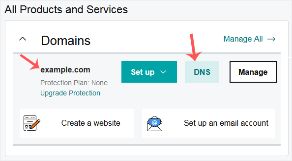 3. After a successful login, under the Domains section. Click on DNS next to the domain you wish to manage.