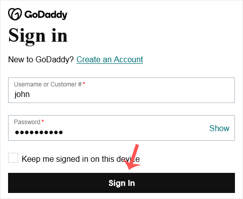 2. Enter the Username or Customer ID and the password of your GoDaddy account. Then click on Sign In.