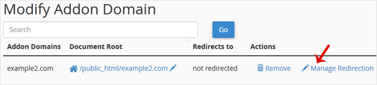 3. تحت قسم تعديل النطاق الإضافي (Modify Addon Domain)، حدد النطاق الإضافي وانقر على إدارة إعادة التوجيه (Manage Redirection).
