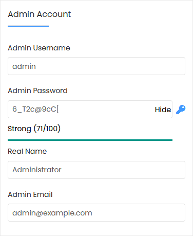 - Admin Username: Your new Bolt username (for security reasons, do not use the administrator or the admin username).
